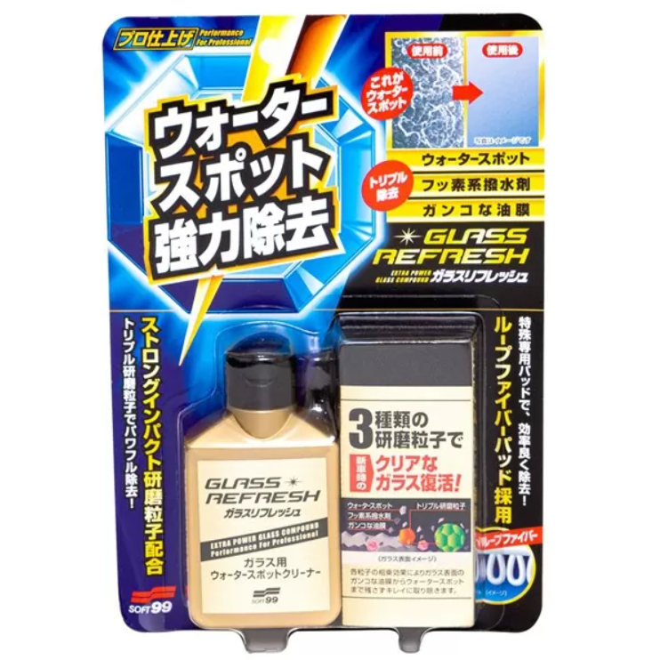 Glass Refresh Soft99 é um poderoso removedor de manchas de vidros(water spot) como: chuva ácida, manchas de cloro, ions, etc. ... Produto a base d'água com Óxido de Cério, que pode ser utilizado em todos os vidros externos do veículo, retrovisores e teto solar.